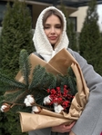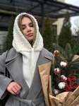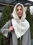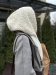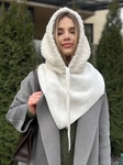 Теплий капор виконаний із тканини букле з флісовою підкладкою та подовженим довʼязом.
