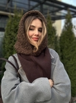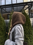 Теплий капор виконаний із тканини букле з флісовою підкладкою та подовженим довʼязом.